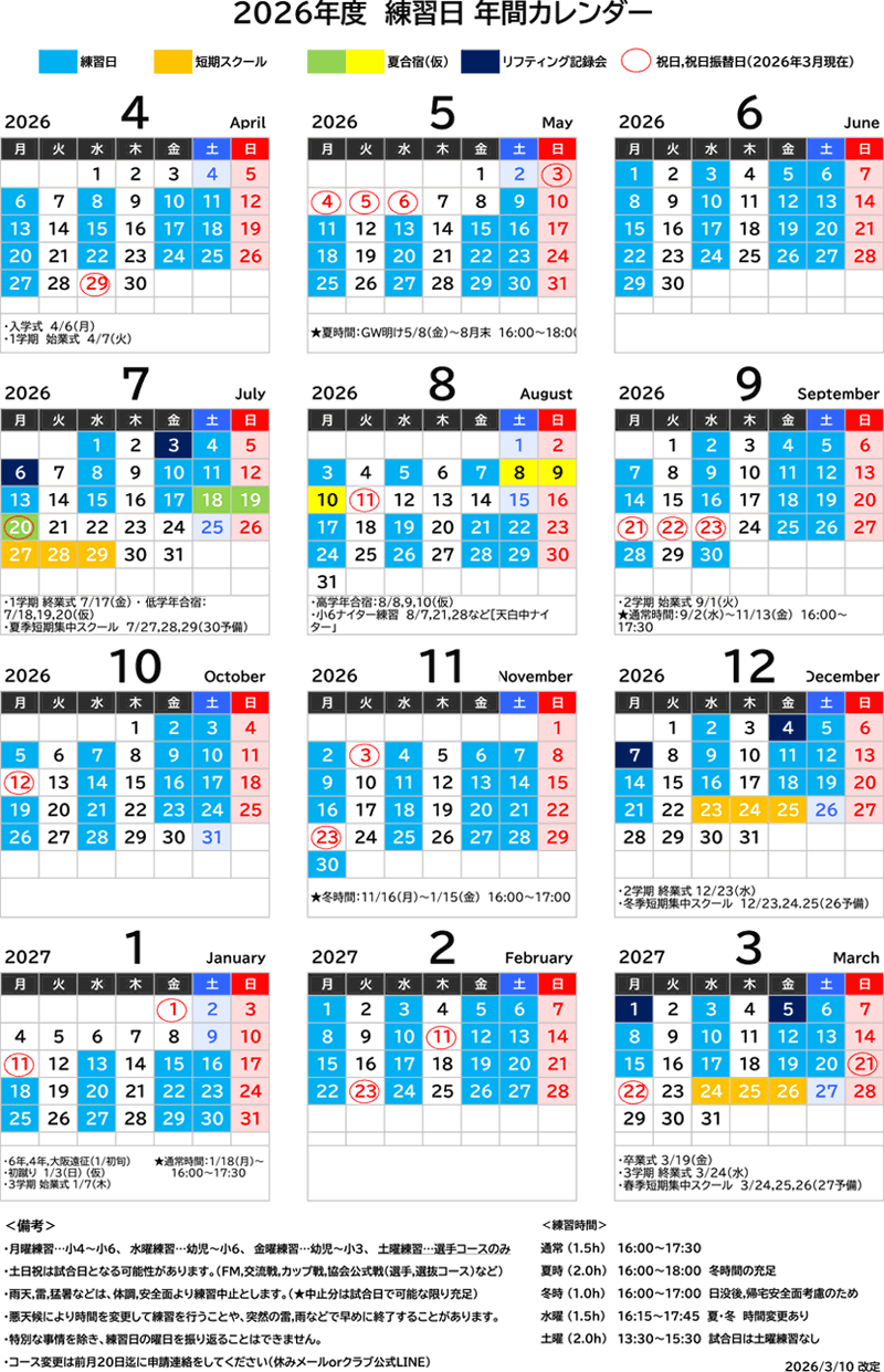 2026年間練習日カレンダー